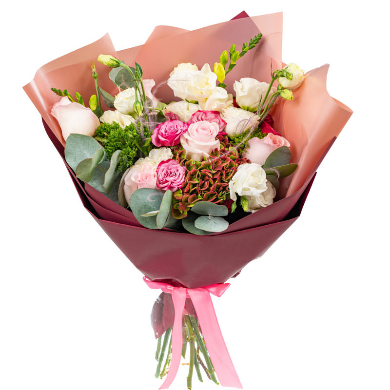 Гортензия, эустома, роза одноголовая, роза кустовая, эвкалипт, зелень.